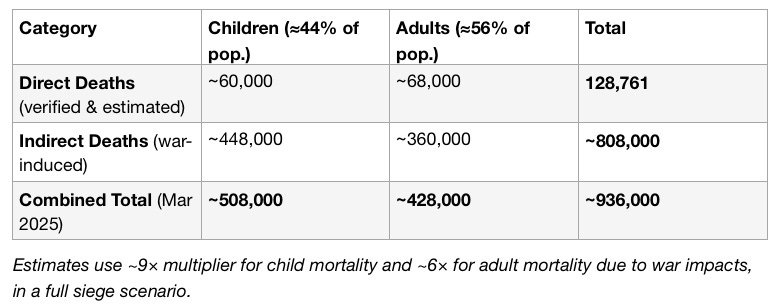 Under these conditions, the total projected death toll reaches ~936,000 to 960,000 Palestinians—nearly 1 million human beings, the majority of them children. This would mean the genocide has already exterminated between 40% and 45% of Gaza’s entire population by March 2025. It is not a projection from fantasy. It is the logical outcome of a sustained, unmitigated campaign of destruction, starvation, disease spread, medical denial, and indiscriminate bombardment.